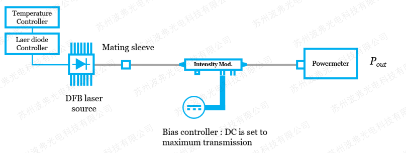 调制器的损耗是由于光纤和波导耦合,光在波导的传输过程等造成的光强衰减。对于强度调制器,需要通过调节调制器的DC偏压(Pin 1&2),以测量调制器的最大传输(输出)功率。对于相位调制器,则无需偏压控制,直接测量输入和输出功率。需要注意的是有和无光学接头(通常为FC/APC)的调制器测量方法的区别,常规产品都是带光纤接头的,所以这里我们仅仅介绍这种测量方法。无光纤接头的测量方法,请联系我们提供详细的调制器手册。 将电光调制器输入功率和输出功率之差定义为插损:
