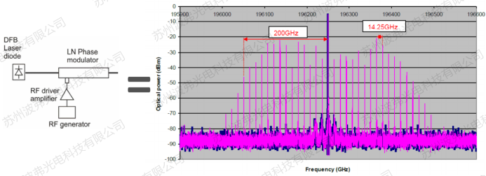 连续激光经过相位调制器后,通过光谱仪测量的结果是载波和多阶边带的频率,其频谱强度服从贝塞尔函数: