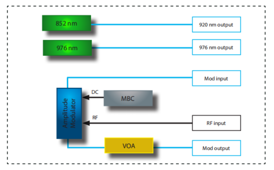 • 内嵌两个激光源,一个852 nm和976 nm低RIN DBR激光器。为了便于使用,省略了一根外部接插线,将激光输出连接到调制器输入光端口。波长和功率可通过前面板控制或ModBox软件接口进行调整。